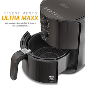 Air Fryer Philco 4,6L Titanium Inox com timer de 30 minutos, temperatura ajustável de 80°C a 200°C, cesto removível antiaderente, sistema de proteção contra superaquecimento e base antiderrapante.Porta-fio