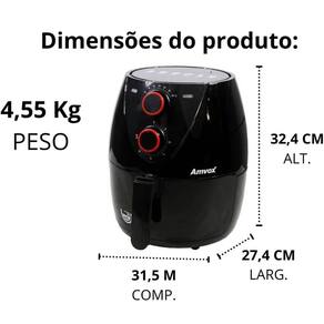Conceito do que é saudável e pratico! A fritadeira elétrica Amvox através do seu mecanismo, movimenta o ar quente dentro do compartimento cozinhando e assando os alimentos rapidamente, sem a necessidade de utilização de óleo, somente através do ar. Com desligamento automático após cozimento, a air fryer 110v conta com temporizador de 30 minutos e LED indicador e pode ser utilizada para outras receitas que normalmente são realizadas no forno convencional, como grelhar, assar e fritar... Além disso, proporciona menos impurezas e odor durante a fritura do alimento quanto comparado a uma frigideira normal, visto que na fritadeira sem óleo a comida é preparada dentro do cesto removível, o que significa menos sujeira de óleo na sua cozinha e menos cheiro de fritura no seu ambiente. Possibilitando além de um alimento saudável, praticidade no preparo e um ambiente organizado.