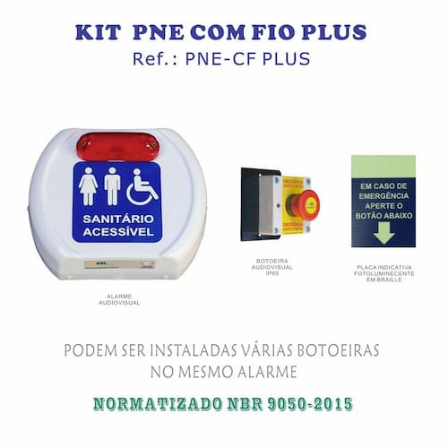ALARME PARA BANHEIRO PARA PESSOAS COM DEFICIÊNCIAMODELO: KIT ALARME PNE COM FIO PLUS REF.: PNECFPLUSEste equipamento é utilizado em banheiros para pessoas com deficiência no caso de uma emergência.Para instalação em sanitários acessíveis e para outros ambientes freqüentados por pessoas com deficiência, mobilidade reduzida e idosos. Oferecendo mais segurança e conforto. É instalado um acionador dentro do banheiro ou quarto, e um alarme com indicador audiovisual do lado externo do banheiro. Em caso de EMERGÊNCIA, quando o botão do acionador for pressionado pelo usuário, o alarme emite um sinal sonoro e visual com flashes de LED de alto brilho ininterruptamente, com o objetivo de alertar os responsáveis pelo monitoramento e vigilância do local sobre eventuais situações de emergência. Para desligar o alarme, basta girar o botão do acionador no sentido horário.Este equipamento foi desenvolvido conforme as exigências da Norma NBR 9050-2020 e o Decreto 5296/2004 garantindo assim a obediência a lei e a obtenção dos alvarás de funcionamento, HABITE-SE e as respectivas ART's, RRT's assinadas por engenheiros e arquitetos profissionais da área, para registro no CREA / CAU da região.Muito fácil de instalar e não precisa de fonte de alimentação especial, é ligado diretamente na rede de energia. A infraestrutura necessária para a instalação do INDICADOR AUDIO VISUAL é de um ponto de energia elétrica 110Vca ou 220Vca do lado de fora do banheiro no local de instalação, e um eletro-duto até o ponto de instalação da BOTOEIRA DE ACIONAMENTO dentro do banheiro.O alarme audiovisual possui um indicador com luz de led vermelho de efeito flash estroboscópico 2Hz, e emite um som intermitente de 70 db.O acionador é uma BOTOEIRA AUDIOVISUAL tipo cogumelo soco, com travamento e destravamento com o giro no sentido horário do botão. Possui um LED INDICADOR e uma CAMPAINHA que emite um alerta visual e sonoro, para garantir a pessoa que acionou a botoeira, que o alarme de emergência foi acionado.O Grau de proteção da botoeira é IP65. Possui uma etiqueta que informa "EMERGÊNCIA APERTE O BOTÃO" escrito em vermelho. Como opção, a botoeira permite ser fixada na mesma furação de uma caixa para interruptor de luz 2x4.O alarme permite adicionar mais botoeiras avulsas, basta ligar as botoeiras em paralelo, uma com a outra e obedecer às cores dos fios. A placa indicativa é fabricada em alumínio com adesivo no tamanho 10 x 7 Cm, que possui o dizer EM CASO DE EMERGÊNCIA APERTE O BOTÃO ABAIXO, é impressa com tinta fotoluminescente UV e também possui o dizer EMERGÊNCIA escrito em BRAILLE, resistente a produtos de limpeza convencional doméstico.O kit é composto dos seguintes itens: 01 Indicador audiovisual (alarme)01 Acionador audiovisual (botoeira) 01 Etiqueta adesiva azul em vinil SANITÁRIO ACESSÍVEL (Masculino) 01 Etiqueta adesiva azul em vinil SANITÁRIO ACESSÍVEL (Feminino) 01 Placa fotoluminescente com o dizer EMERGÊCIA escrito em BRAILLE.01 Manual de instalação em português.ESPECIFICAÇÕES TÉCNICAS:Produto: KIT PNE COM FIO PLUS Ref.: CF PLUSTensão de alimentação: Bivolt automático (de 100 a 240 Vca).Consumo: 200mW.Ligação: Direto na rede de energia.Saída para botoeira: Isolada sem risco de choque elétrico.Temperatura de trabalho: -10ºC a 50ºC.Umidade relativa do ar: < 90%.Luz de LED intermitente: 2HZ.Intensidade sonora: 70 db +/- 10%.Grau de proteção do acionador: IP65.Etiquetas adesivas em alumínio: Tipo fotoluminescente - limpeza com detergente doméstico.Normatização aplicada: Norma NBR 9050-2015.Característica complementar: Unidade eletrônica encapsulada resistente a umidade.Indústria Brasileira.MARCA: SOL SUSTENTAVELGARANTIA: 12 MESES (DO FABRICANTE NO BRASIL)
