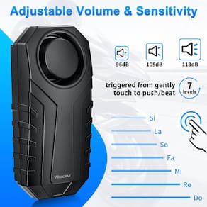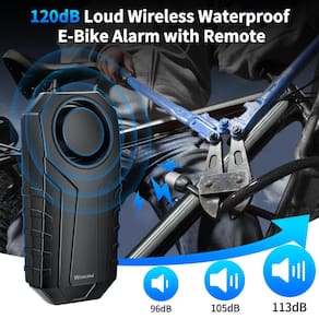Alarme de bicicleta sem fio com controle remoto, sistema de alarme de bicicleta antifurto, IP65 à prova d'água, alarmes de bicicleta altos de 113 dB para bicicletas elétricas, motocicletas, scooter, segurança ao ar livre e ciclismo - [Alarme multiusos] O alarme com sensor de vibração não é apenas adequado para bicicletas elétricas, motocicletas, scooters, carros, trailers, carros de golfe, acessórios indispensáveis para motocicletas, mas também adequado para caixa de correio, bagagem, portas e janelas, um dispositivo efetivamente antifurto - [Controle remoto e à prova d'água] Controle sem fio por controle remoto, forte alcance sem fio de até 100 m. Função de pesquisa de veículo/Criador de ruído remoto, fácil de encontrar seus veículos no estacionamento ou fazer barulho quando você precisar, 3 tipos de sons de sino para sua escolha. IP65 à prova d'água, adequado para uso externo - [Volume ajustável e sensibilidade ajustável] Volume ajustável de 3 alavancas, não se preocupe com o alarme ser extremamente alto ou não alto. Sensibilidade ajustável de 7 níveis de toque suave a empurrar ou bater, fácil de definir conforme sua necessidade - [Alarme alto e ótimo desempenho] Alarme alto de até 113 dB, assuste potenciais ladrões de forma eficaz. Processo bem feito, tecnologia de economia de bateria da 4ª versão e tecnologia de sensor atualizada permitem que este alarme antirroubo tenha ótimo desempenho de qualidade - [Função SOS e fácil de insalar] Usando algoritmos de movimento maduros e sensor preciso, o alarme disparará automaticamente para chamar ajuda quando você cair. Você pode ativar ou desativar a função SOS. Instalação super fácil colando com adesivo de dupla face e amarrando-o com alça