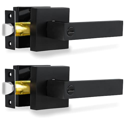 RAZCC Maçaneta de porta interior de privacidade, maçanetas de porta pretas foscas resistentes, maçanetas quadradas para quarto e banheiro, maçanetas de fechadura sem chave para portas do lado direito e esquerdo - MATERIAL PREMIUM: Esta maçaneta de porta de privacidade de estilo moderno é resistente e estável, feita de liga de zinco resistente e metal, acabamento preto fosco - ESPECIFICAÇÃO: Adapta-se à espessura padrão da porta: 1-3/20.2 cm a 1-3/10.2 cm (35 mm-45 mm) e trava ajustável 2-3/20.2 cm ou 2-3/10.2 cm (60 mm ou 70 mm), a placa de trava não é removível. Maçaneta preta vem com uma placa quadrada, permite que você substitua a sua existente - FUNÇÃO DE PRIVACIDADE: Maçanetas interiores sem chave com botão de virar (travar e desbloquear) e exterior com botão de liberação de emergência. Quando você está trancado dentro, o exterior pode destrancar a porta com uma moeda ou chave de fenda, nenhuma chave é necessária - Ampla aplicação: Esta maçaneta interna é reversível, o que significa que pode ser usada tanto no lado esquerdo quanto no lado direito. Projetado para completar portas interiores de estilo convencional e moderno para banheiros, quartos, escritórios, quartos ou outros lugares, privacidade necessária - INSTALAÇÃO FÁCIL: O cadeado da maçaneta da porta tem instruções de instalação e componentes necessários no pacote, ajudará você a instalá-lo melhor, instalação em apenas alguns minutos para economizar seu tempo