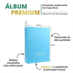 um dos grandes benefícios da laminação fosca é oferecer impermeabilidade e resistência. Outro grande benefício é que, por proporcionar um toque aveludado ao impresso, minimiza as marcas de gordura dos dedos na capa dos álbuns. Parte interna com folhas de plásticos rebitados para inserir as fotos da medida 10x15