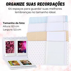 Álbum capa dura premium porta retrato para foto instax mini Cor: lilás dê um toque especial às suas lembranças com o álbum para foto instax mini disponível em diversas cores vibrantes, ele oferece estilo e proteção para suas fotos favoritas. com capa dura resistente e um design pensado para organização, o álbum possui 64 espaços perfeitos para armazenar suas memórias com segurança e praticidade. Além disso, você pode personalizar a capa frontal com uma de suas fotos preferidas, tornando-o único e especial. cada compartimento é projetado sob medida para fotos de câmera instax mini, com o tamanho ideal de 8,5 cm de altura por 5,5 cm de largura, garantindo um encaixe perfeito e preservando suas recordações para sempre. leve suas melhores lembranças com você compacto e leve, esse álbum é perfeito para carregar e exibir seus momentos especiais onde quer que vá. Organize suas fotos com estilo ------------------ ------------------ quantas fotos cabem no álbum R: o álbum possui capacidade para armazenar até 64 fotos, organizadas de maneira prática e segura. quais são as dimensões das fotos que cabem no álbum R: ele é projetado para fotos com 8,5 cm de altura e 5,5 cm de largura, sendo ideal para fotos capturadas com a câmera instax mini. o álbum possui capa dura R: sim, o álbum possui uma capa dura resistente que protege suas memórias e ainda permite personalizar a capa frontal com uma foto. ------------------ Especificações ------------------ Capacidade: 64 fotos. Dimensões das fotos: 8,5 cm altura x 5,5 cm largura . Dimensões do álbum: 14 cm altura x 11,5 cm largura . Compatibilidade de fotos: câmera instax mini. ------------------ Conteúdo ------------------ 1x álbum de fotos. Anúncio referente a álbum Acessórios que ambientam as fotos não inclusos. ------------------ Apresentação: ------------------ - qualidade garantida. - atendimento qualificado. - enviamos para todo o brasil. - compra garantida. - despachamos em até 1 dia útil após confirmação do pagamento Garantimos a devolução por arrependimento em até 7 dias, após o recebimento e de 15 dias contra defeitos de fabricação. Marca: Não Informado
