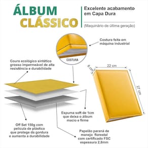 Atenção O valor do anúncio corresponde a 1 album 10x15, ferragem com 500 fotos 10x15. Despacho em 24 horas Tem alguma dúvida. Faça-nos uma pergunta Descrição:Álbum de fotos para guardar e proteger suas recordações. Os albuns de couro costurados possuiem capas macias e almofadas, isso porque ela e costurada de couro sintetico e preenchida com espuma internamente. Produto de qualidade e durabilidade, fabricada com os melhores materias do mercado.O sistema de ferragem permite a inclusão de mais folhas para ampliar o numero de fotos.Tem capacidade para até 500 fotos 10x15 4 fotos por pagina Ou250 fotos 15x21 2 fotos por pagina comprando refil de 15x21 Possui memo central para descrição das suas fotosPlastico de polipropileno transparente que protege as fotos.Nunca use pvcFicha técnica-Album de papelao parana duro costurada com couro sintético e preenchida com espuma internamente.Parte interna com 125 folhas plásticas de polipropileno com furos para ferragem de 3 argolas para 300 fotos 10x15Comprimento : 520 mm aberto 220mm fechado Largura : 80 mmAltura : 270 mmPara isso basta navegar por nossos anúncios em, mais anúncios do vendedor ou em ver todos os anuncios e adicionar ao carrinho os produtos desejados um de cada vez.Dúvidas frequentes:Pergunta :o album do anuncio e para quantas fotosRespostao album vem para 500 fotos 10x15 História clipO suíço, alexander buholzer decidiu quando mais velho vir a america do sul. O clima e a recepção dos brasileiros fizeram com que o brasil se destacasse entre os outros países, e , portanto em 1994, escolheu ficar e montar sua empresa nesta linda terra tropical.Alex desde pequeno tinha um grande interesse em guardar todos os retratos da sua família, principalmente, porquê sem estas fotos não existiriam histórias . Assim nasceu a empresa clip juntos com ela todos os seus álbuns, porta retratos e produtos para guardar suas melhores lembranças de vida................