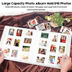 - Exibir 640 fotos Contém 640 fotos no total, este álbum contém 64 páginas individuais com 10 fotos por página, abre como um livro para facilitar a visualização. Ideal para casamentos, noivados, formaturas, fotos de bebês ou outras obsessões artísticas.