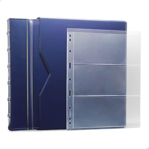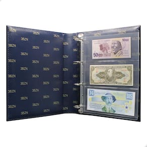 O Álbum de Luxo Azul 10 Folhas para 30 Cédulas 3BZN P é um kit de fichário que acompanha folhas para cédulas em acetato tamanho 28x21cm, a transparência da folha é alta e cristalina, de forma que é possível ver sua cédula sem interferências, e de ambos os lados: frente e verso, dessa forma é possível apreciar sua coleção da melhor forma. Esse kit de folhas é feito em um material resistente sendo o principal organizador de cédulas colecionáveis para colecionador.