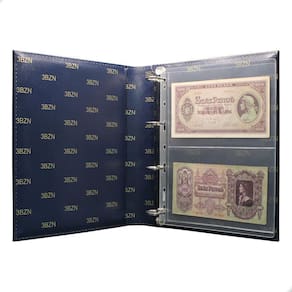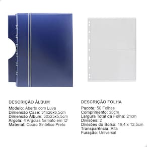 O Álbum de Luxo Azul 50 Folhas para 100 Cédulas 3BZN P é um kit de fichário que acompanha folhas para cédulas em acetato tamanho 28x21cm, a transparência da folha é alta e cristalina, de forma que é possível ver sua cédula sem interferências, e de ambos os lados: frente e verso, dessa forma é possível apreciar sua coleção da melhor forma. Esse kit de folhas é feito em um material resistente sendo o principal organizador de cédulas colecionáveis para colecionador.