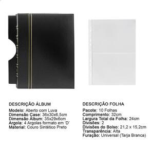 O Álbum de Luxo Preto 10 Folhas PP para 20 Cédulas 3BZN G é um kit de fichário que acompanha Folhas PP. Seu acabamento é transparente, podendo visualizar as cédulas frente e verso. Essa folha é ideal para você criar aquele mostruário que sempre desejou com sua coleção de cédulas antigas, nacionais ou estrangeras e finalmente poder mostrar sua coleção toda organizada para sua família e amigos.
