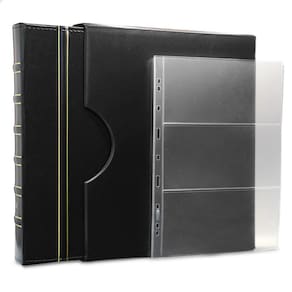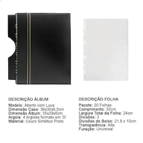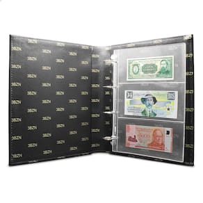O Álbum de Luxo Preto 10 Folhas para 60 Cédulas 3BZN G é um kit de fichário que acompanha folhas para cédulas em acetato tamanho 32x24cm, a transparência da folha é alta e cristalina, de forma que é possível ver sua cédula sem interferências, e de ambos os lados: frente e verso, dessa forma é possível apreciar sua coleção da melhor forma. Esse kit de folhas é feito em um material resistente sendo o principal organizador de cédulas colecionáveis para colecionador.