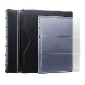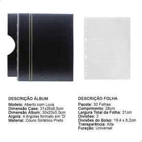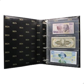 O Álbum de Luxo Preto 30 Folhas para 90 Cédulas 3BZN P é um kit de fichário que acompanha folhas para cédulas em acetato tamanho 28x21cm, a transparência da folha é alta e cristalina, de forma que é possível ver sua cédula sem interferências, e de ambos os lados: frente e verso, dessa forma é possível apreciar sua coleção da melhor forma. Esse kit de folhas é feito em um material resistente sendo o principal organizador de cédulas colecionáveis para colecionador.