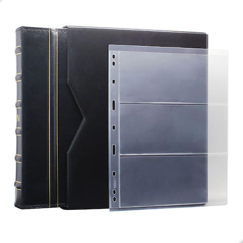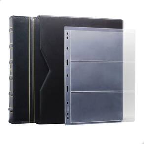 O Álbum de Luxo Preto 50 Folhas para 150 Cédulas 3BZN P, é um kit de fichário que acompanha folhas para cédulas em acetato tamanho 28x21cm, a transparência da folha é alta e cristalina, de forma que é possível ver sua cédula sem interferências, e de ambos os lados: frente e verso, dessa forma é possível apreciar sua coleção da melhor forma. Esse kit de folhas é feito em um material resistente sendo o principal organizador de cédulas colecionáveis para colecionador.