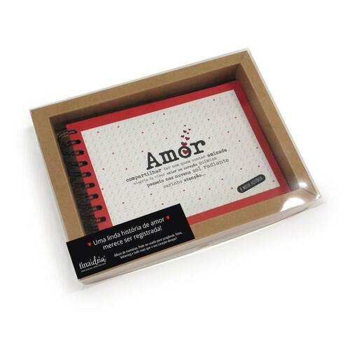 Album de memorias Amor Fina Ideia Capa dura, miolo com 30 folhas pretas 180g, formato 19,5x13,5cm, encadernação em wire-o e hot stamp na capa. Embalagem em caixa de papel kraft e tampa em acetato transparente. Medidas: 24,5x18,5x3cm, fechamento com tag adesiva com mensagem. Ean: 7899160013011