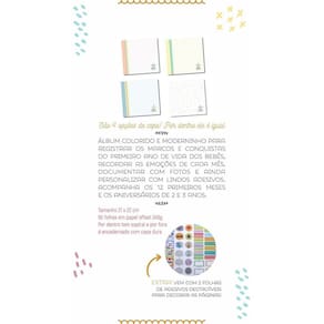 Álbum do bebê Rosa Neste álbum colorido e moderninho você vai registrar os marcos e conquistas do primeiro ano de vida dos bebês, recordar as emoções de cada mês, documentar com fotos e ainda personalizar com lindos adesivos. Momentos únicos em um álbum para guardar e compartilhar pela vida toda. O livrinho acompanha os 12 primeiros meses, o aniversário de 2 anos e o aniversário de 3 anos.