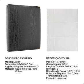 Álbum Fichário 10 Folhas para Cédulas 3 Espaços com Bolso 32x24 Ziper Cobra GG