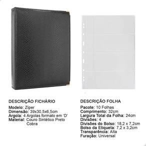 O fichário é produzido em capa sintética com cantoneiras para proteção, material de alta qualidade para armazenar com segurança e de forma organizada sua coleção, ele é muito resistente confeccionado com 4 argolas em formato ‘D’ em aço inoxidável reforçado, permitindo o encaixe da folha de até 32x24cm, processo de fabricação artesanal permitindo um excelente acabamento.