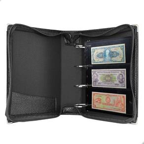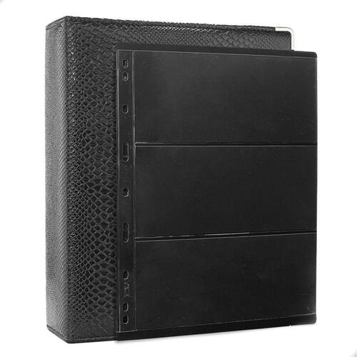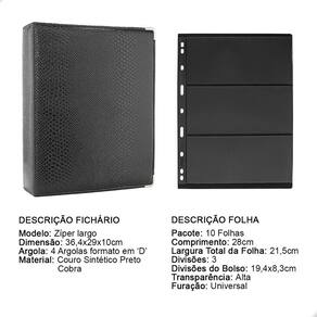 O Álbum Fichário 10 Folhas para Selos 3 Espaços 28x21 Cobra XL, é um kit de fichário que acompanha folhas para selos em acetato preto tamanho 28x21cm, a transparência da folha é alta e cristalina, de forma que é possível ver sua cédula sem interferências, dessa forma é possível apreciar sua coleção da melhor forma. Esse kit de folhas é feito em um material resistente sendo o principal organizador de cédulas colecionáveis para colecionador.