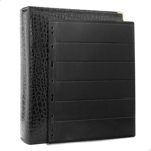 O Álbum Fichário 10 Folhas para Selos 6 Espaços 28x21 Cobra XL, é um kit de fichário que acompanha folhas para selos em acetato preto tamanho 28x21cm, a transparência da folha é alta e cristalina, de forma que é possível ver sua cédula sem interferências, dessa forma é possível apreciar sua coleção da melhor forma. Esse kit de folhas é feito em um material resistente sendo o principal organizador de cédulas colecionáveis para colecionador.