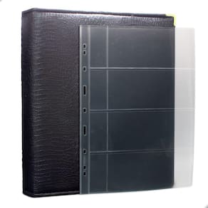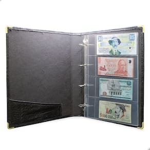 Álbum Fichário 20 Folhas para Cédulas 4 Espaços com Bolso 32x24 Cobra Fosco GF, é um kit de fichário que acompanha folhas para cédulas em acetato tamanho 32x24cm, a transparência da folha é alta e cristalina, de forma que é possível ver sua cédula sem interferências, e de ambos os lados: frente e verso, dessa forma é possível apreciar sua coleção da melhor forma. Esse kit de folhas é feito em um material resistente sendo o principal organizador de cédulas colecionáveis para colecionador.