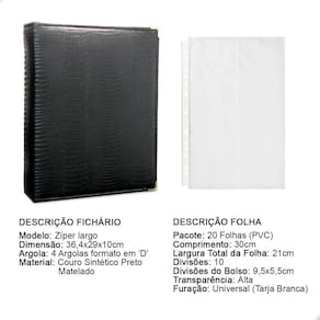 O fichário é produzido em capa sintética com cantoneiras para proteção, material de alta qualidade para armazenar com segurança e de forma organizada sua coleção, ele é muito resistente confeccionado com 4 argolas em formato ‘D’ em aço inoxidável reforçado, permitindo o encaixe da folha de até 30x21cm, processo de fabricação artesanal permitindo um excelente acabamento.