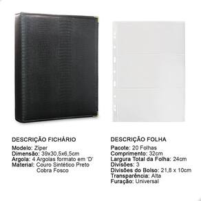 Álbum Fichário 20 Folhas para Cédulas 3 Espaços 32x24 Ziper Cobra Fosco GG, é um kit de fichário que acompanha folhas para cédulas em acetato tamanho 32x24cm, a transparência da folha é alta e cristalina, de forma que é possível ver sua cédula sem interferências, e de ambos os lados: frente e verso, dessa forma é possível apreciar sua coleção da melhor forma. Esse kit de folhas é feito em um material resistente sendo o principal organizador de cédulas colecionáveis para colecionador.