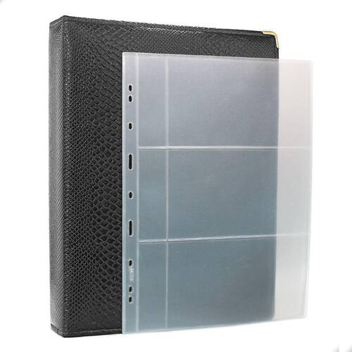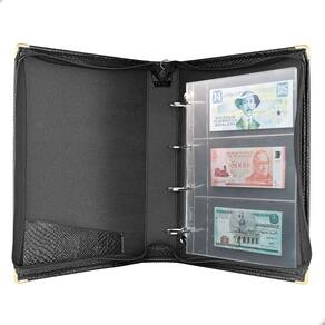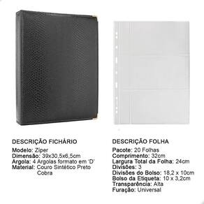 Álbum Fichário 20 Folhas para Cédulas 3 Espaços com Bolso 32x24 Ziper Cobra GG, é um kit de fichário que acompanha folhas para cédulas em acetato tamanho 32x24cm, a transparência da folha é alta e cristalina, de forma que é possível ver sua cédula sem interferências, e de ambos os lados: frente e verso, dessa forma é possível apreciar sua coleção da melhor forma. Esse kit de folhas é feito em um material resistente sendo o principal organizador de cédulas colecionáveis para colecionador.