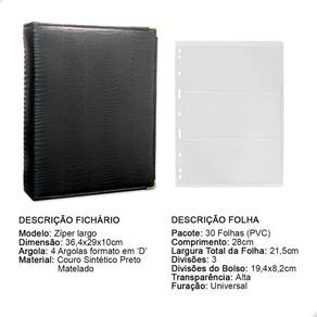 O fichário é produzido em capa sintética com cantoneiras para proteção, material de alta qualidade para armazenar com segurança e de forma organizada sua coleção, ele é muito resistente confeccionado com 4 argolas em formato ‘D’ em aço inoxidável reforçado, permitindo o encaixe da folha de até 28x21cm, processo de fabricação artesanal permitindo um excelente acabamento.