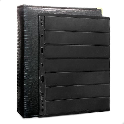 O Álbum Fichário 30 Folhas para Selos 7 Espaços 28x21 Cobra Fosco XL, é um kit de fichário que acompanha folhas para selos em acetato preto tamanho 28x21cm, a transparência da folha é alta e cristalina, de forma que é possível ver sua cédula sem interferências, dessa forma é possível apreciar sua coleção da melhor forma. Esse kit de folhas é feito em um material resistente sendo o principal organizador de cédulas colecionáveis para colecionador.