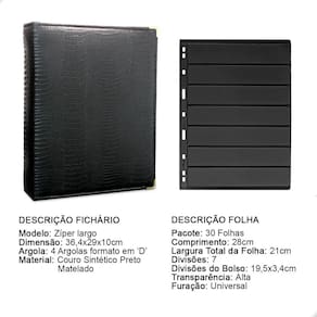 O fichário é produzido em capa sintética com cantoneiras para proteção, material de alta qualidade para armazenar com segurança e de forma organizada sua coleção, ele é muito resistente confeccionado com 4 argolas em formato ‘D’ em aço inoxidável reforçado, permitindo o encaixe da folha de até 28x21cm, processo de fabricação artesanal permitindo um excelente acabamento.
