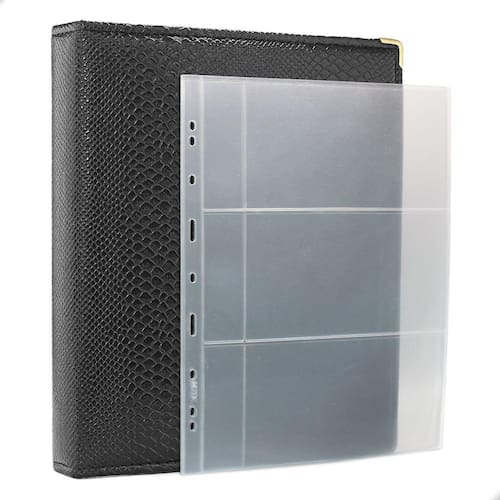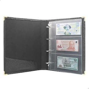 Álbum Fichário 40 Folhas para Cédulas 3 Espaços com Bolso 32x24 Cobra GF, é um kit de fichário que acompanha folhas para cédulas em acetato tamanho 32x24cm, a transparência da folha é alta e cristalina, de forma que é possível ver sua cédula sem interferências, e de ambos os lados: frente e verso, dessa forma é possível apreciar sua coleção da melhor forma. Esse kit de folhas é feito em um material resistente sendo o principal organizador de cédulas colecionáveis para colecionador.