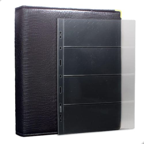 Álbum Fichário 40 Folhas para Cédulas 4 Espaços 32x24 Cobra Fosco GF, é um kit de fichário que acompanha folhas para cédulas em acetato tamanho 32x24cm, a transparência da folha é alta e cristalina, de forma que é possível ver sua cédula sem interferências, e de ambos os lados: frente e verso, dessa forma é possível apreciar sua coleção da melhor forma. Esse kit de folhas é feito em um material resistente sendo o principal organizador de cédulas colecionáveis para colecionador.