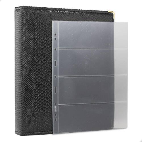 Álbum Fichário 40 Folhas para Cédulas 4 Espaços 32x24 Cobra GF, é um kit de fichário que acompanha folhas para cédulas em acetato tamanho 32x24cm, a transparência da folha é alta e cristalina, de forma que é possível ver sua cédula sem interferências, e de ambos os lados: frente e verso, dessa forma é possível apreciar sua coleção da melhor forma. Esse kit de folhas é feito em um material resistente sendo o principal organizador de cédulas colecionáveis para colecionador.