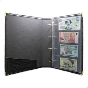 Álbum Fichário 40 Folhas para Cédulas 4 Espaços com Bolso 32x24 Cobra Fosco G, é um kit de fichário que acompanha folhas para cédulas em acetato tamanho 32x24cm, a transparência da folha é alta e cristalina, de forma que é possível ver sua cédula sem interferências, e de ambos os lados: frente e verso, dessa forma é possível apreciar sua coleção da melhor forma. Esse kit de folhas é feito em um material resistente sendo o principal organizador de cédulas colecionáveis para colecionador.