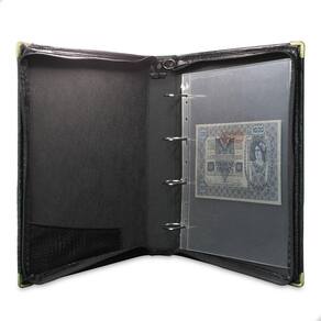 Álbum Fichário 40 Folhas para Cédulas 1 Espaço 32x24 Ziper Cobra Fosco GG, é um kit de fichário que acompanha folhas para cédulas em acetato tamanho 32x24cm, a transparência da folha é alta e cristalina, de forma que é possível ver sua cédula sem interferências, e de ambos os lados: frente e verso, dessa forma é possível apreciar sua coleção da melhor forma. Esse kit de folhas é feito em um material resistente sendo o principal organizador de cédulas colecionáveis para colecionador.