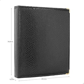 O fichário é produzido em capa sintética com cantoneiras para proteção, material de alta qualidade para armazenar com segurança e de forma organizada sua coleção, ele é muito resistente confeccionado com 4 argolas em formato ‘D’ em aço inoxidável reforçado, permitindo o encaixe da folha de até 32x24cm, processo de fabricação artesanal permitindo um excelente acabamento.