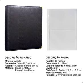 O fichário é produzido em capa sintética com cantoneiras para proteção, material de alta qualidade para armazenar com segurança e de forma organizada sua coleção, ele é muito resistente confeccionado com 4 argolas em formato ‘D’ em aço inoxidável reforçado, permitindo o encaixe da folha de até 32x24cm, processo de fabricação artesanal permitindo um excelente acabamento.