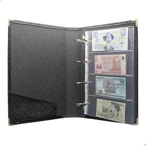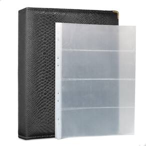Álbum Fichário 40 Folhas PP para Cédulas 4 Espaços 32x24 Cobra G, é um kit de fichário que acompanha Folhas PP para cédulas em acetato tamanho 32x24cm, a transparência da folha é alta e cristalina, de forma que é possível ver sua cédula sem interferências, e de ambos os lados: frente e verso, dessa forma é possível apreciar sua coleção da melhor forma. Esse kit de folhas é feito em um material resistente sendo o principal organizador de cédulas colecionáveis para colecionador.