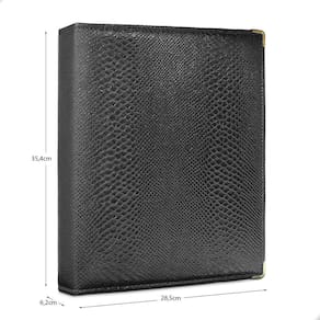 O fichário é produzido em capa sintética com cantoneiras para proteção, material de alta qualidade para armazenar com segurança e de forma organizada sua coleção, ele é muito resistente confeccionado com 4 argolas em formato ‘D’ em aço inoxidável reforçado, permitindo o encaixe da folha de até 32x24cm, processo de fabricação artesanal permitindo um excelente acabamento.