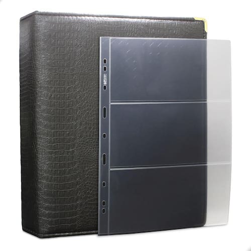 Álbum Fichário 50 Folhas para Cédulas 3 Espaços 32x24 Cobra Fosco G, é um kit de fichário que acompanha folhas para cédulas em acetato tamanho 32x24cm, a transparência da folha é alta e cristalina, de forma que é possível ver sua cédula sem interferências, e de ambos os lados: frente e verso, dessa forma é possível apreciar sua coleção da melhor forma. Esse kit de folhas é feito em um material resistente sendo o principal organizador de cédulas colecionáveis para colecionador.