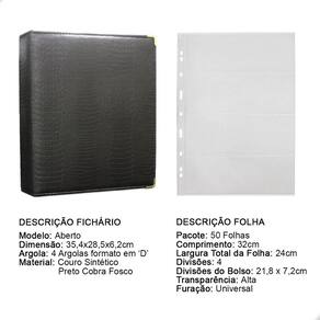 O fichário é produzido em capa sintética com cantoneiras para proteção, material de alta qualidade para armazenar com segurança e de forma organizada sua coleção, ele é muito resistente confeccionado com 4 argolas em formato ‘D’ em aço inoxidável reforçado, permitindo o encaixe da folha de até 32x24cm, processo de fabricação artesanal permitindo um excelente acabamento.