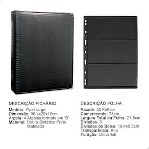O Álbum Fichário 50 Folhas para Selos 3 Espaços 28x21 Cobra Fosco XL, é um kit de fichário que acompanha folhas para selos em acetato preto tamanho 28x21cm, a transparência da folha é alta e cristalina, de forma que é possível ver sua cédula sem interferências, dessa forma é possível apreciar sua coleção da melhor forma. Esse kit de folhas é feito em um material resistente sendo o principal organizador de cédulas colecionáveis para colecionador.