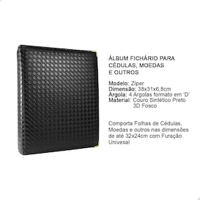 O Álbum Fichário para Cédulas e Moedas Ziper 3D Fosco GG é produzido em capa sintético com cantoneiras para proteção. O material é de alta qualidade para armazenar com segurança e de forma organizada sua coleção de cédulas, moedas e outros materiais.É confeccionado com 4 argolas em formato em 'D' em aço inoxidável reforçado permitindo encaixe de folha de inserção de até 32x24cm.O processo de fabricação é artesanal garantindo um material de excelente acabamento.O álbum comporta folhas nas seguintes dimensões:PARA MOEDAS:- 15 folhas de 42 bolsos 32x24cm (vazias)- 15 folhas de 30 bolsos 32x24cm (vazias)- 15 folhas de 20 bolsos 32x24cm (vazias)OBS: A quantidade de folhas foi calculado com as mesmas vazias, podendo assim variar de acordo com a espessura da moeda. Não é aconselhado completar o álbum com sua capacidade total de folhas com moedas por conta do peso.PARA CÉDULAS:- 50 folhas de 2 bolsos 32x24cm (vazias)- 50 folhas de 3 bolsos 32x24cm (vazias)- 50 folhas de 6 bolsos 32x24cm (vazias)OBS: A variação da quantidade de folhas para cédulas que o álbum comporta é menor por conta da espessura da cédula ser pequena.CARACTERÍSTICAS:Material: SintéticoCor: PretoDimensão do Fichário: 38x31x6,8cmQuantidade de argolas: 4 (furação universal)Espaço entre argolas: 8cmOBS: Não acompanha folhas. Não é aconselhável colocar no mesmo álbum cédulas e moedas juntas