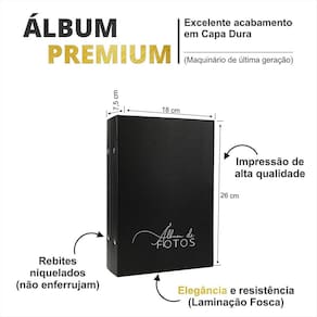 um dos grandes benefícios da laminação fosca é oferecer impermeabilidade e resistência. Outro grande benefício é que, por proporcionar um toque aveludado ao impresso, minimiza as marcas de gordura dos dedos na capa dos álbuns. Parte interna com folhas de plásticos rebitados para inserir as fotos da medida 10x15 tem capacidade para até 512 fotos 10x15 4 fotos por página possui memo central para descrição das suas fotos