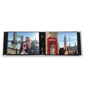 Álbum com capacidade fixa, encadernação com rebites. Formato horizontal com fita de cetim. Capa dura impressa com laminação brilhante. Folhas em plástico texturizado preto. 60 Fotos 10x15