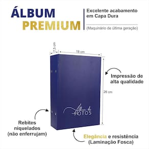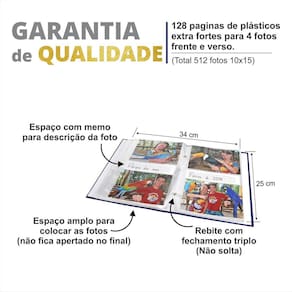 um dos grandes benefícios da laminação fosca é oferecer impermeabilidade e resistência. Outro grande benefício é que, por proporcionar um toque aveludado ao impresso, minimiza as marcas de gordura dos dedos na capa dos álbuns. Parte interna com folhas de plásticos rebitados para inserir as fotos da medida 10x15 tem capacidade para até 512 fotos 10x15 4 fotos por página possui memo central para descrição das suas fotos
