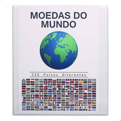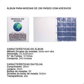 Álbum para Moedas de 230 Países com AdesivosO Álbum para Moedas de 230 Países com Adesivos tem 240 espaços para armazenar moedas, acompanha 230 adesivos com diversos países e uma lista de controle para facilitar na organização e identificação de suas peças.Cada adesivo possui informações de nome e bandeira de determinado país e o respectivo continente. A lista de controle apresenta as mesmas informações.O álbum é composto por 12 folhas e cada folha possui 20 bolsos de 5cm de altura e largura, essa medida permite que você inclua coins holder nos bolsos. As folhas do álbum são transparentes e possibilitando a visualização do anverso e reverso das moedas.A abertura dos bolsos é pela parte superior, na frente da folha. Para colocar sua moeda no bolso da folha, abra o bolso que deseja guardar a moeda e a insira com cuidado. Posicione-a corretamente para ficar alinhada, e pronto.CARACTERÍSTICAS DO ÁLBUMMétodo Encaixe de moedas: bolso sem abaDimensão: 25,3x29x3cmN.º de Folhas: 12 folhasComporta: 240 moedasCARACTERÍSTICAS DA FOLHAComprimento: 28cmLargura: 24cmBolsos de moedas: 20Dimensões do bolso de moeda: 5x5cmTransparência: Alta
