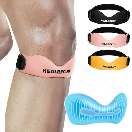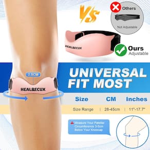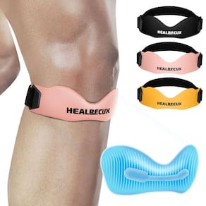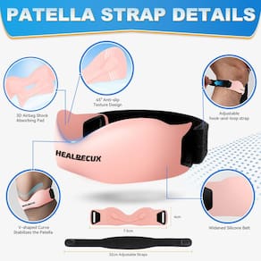 - Faixa ergonômica de silicone para patela: projetada para proteger sua patela a cada passo do caminho. Possui um acolchoamento de "20.3 cm que aplica pressão direcionada ao tendão patelar, ajudando a deslocar a pressão para longe do tendão para aliviar a dor e reduzir a tensão durante a atividade física. A joelheira de silicone ultra-flexível curva em V se adapta à forma do seu joelho, proporcionando compressão precisa de 360°