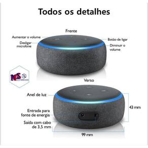 Descrição alexa echo dot 4 geraçao a amazon echo é a caixa de som inteligente que chega como o carro chefe da alexa, assistente pessoal da empresa, sendo o modelo que oferece a melhor qualidade de som entre os modelos vendidos no brasil. O que é alexa. . . Assim como suas concorrentes a alexa é uma assistente conversacional, capaz de entender contexto até certo ponto e executar tarefas simples, como configurar alarmes, informar a situação do trânsito ou a previsão do tempo, executar uma lista de músicas ou reproduzir podcasts. Lançamento: 2021 dimensão: 148 x 99 x 99 mm peso: 780 gramas sistema: amazon alexa wireless: sim potência de som: woofer de neodímio 3 e tweeter de 0,6 como usar a alexa 1. De 8 faça login na sua conta amazon para utilizar a alexa foto: reprodução/helito beggiora. . . . 2. De 8 selecione o dispositivo amazon alexa e confirme seu nome foto: reprodução/helito beggiora. O que a alexa pode fazer controlar a casa inteligente:. . . Fazer uma chamada:. . . Organizar a agenda:. . . Saber as principais notícias do dia:. . . Escolher uma música ou filme:. . . Pedir um uber:. . . Pedir uma refeição no ifood:. . . Receber ajuda nas tarefas: antes de comprar: -leia o anúncio com atenção. -tire suas dúvidas com o vendedor. -certifique-se que a , cor do produto estão corretos. -o valor do deve ser somado ao preço do produto. -. Agora já pode efetuar a compra. Homologação anatel: 060792000160