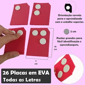 Facilite o aprendizado e a inclusão com o alfabeto braille em eva, desenvolvido especialmente para auxiliar crianças no reconhecimento das letras de forma tátil. Cada uma das 26 placas conta com pontos de 2 cm de diâmetro, proporcionando maior clareza e compreensão para os pequenos. O recorte na parte superior ajuda a identificar a posição correta da letra, tornando o uso ainda mais intuitivo. Feito de eva leve, flexível e resistente, este material garante segurança, conforto e durabilidade para muitos anos de aprendizado.