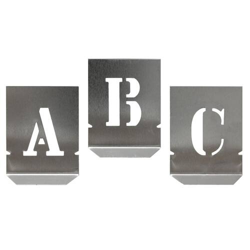 Alfabeto Chapa Vazada Aço 100 mm - 27 peças Alfabeto em chapa vazada em aço galvanizado Espessura: aproximadamente 0,4mm Utilizados como gabarito para pinturas Sequência alfabética do A ao Z + & 27 peças Altura das letras: 100mm Marca: Noll - Amatools