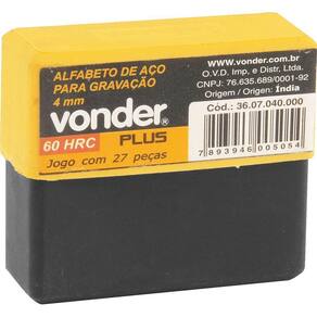 Alfabeto De Aço Punção 4mm A-z Para Gravação - Vonder Plus Conteúdo da embalagem 1 Jogo de alfabeto de aço com letras de A até Z Aplicações e dicas de uso Indicado para fazer gravação/marcação em baixo relevo na identificação de peças e equipamentos Destaques e diferenciais Fabricado em aço temperado de maior dureza, proporcionando excelente resistência DETALHES TÉCNICOS